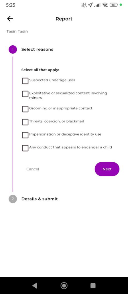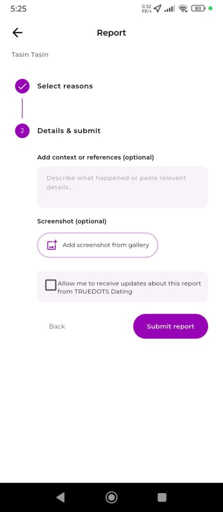 TRUEDOTS provides users with mechanisms within the app to report safety concerns, inappropriate behavior, suspicious accounts, exploitative content, impersonation, harassment, and potential child safety violations.